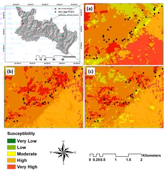 Currently, data-based models show fairly good results in the natural hazard susceptibility assessments [,,]. We used a data-based frequency ratio (FR) model for LSM in the Gorkha region. FR is based on data from previous landslides and causal factors and their spatial coverage []. Several studies used FR to generate LSMs at regional or small scales, such as [,,,,,,,]. A study carried out in Selangor, Malaysia by [] concluded that the FR model shows a correlation between landslide causal factors and the location of past landslides in a given study area. As the weightings of the FR model are directly based on the density of the past landslides in the study area, it is sensitive to the use of different training datasets.