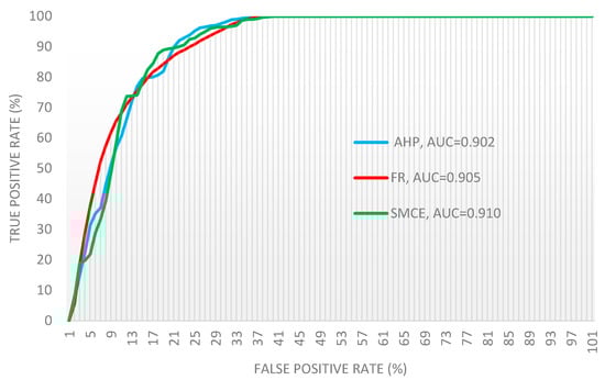 The ROC curve [] was used to validate different resulting landslide susceptibility maps using our validation data. The ROC approach displays a full scene of trade-off among the true-positive rate (TPR) and the false-positive rate (FPR) in the landslide susceptibility maps []. ROC curves were calculated for all three resulting landslide susceptibility maps. The vertical axis indicates the TPR, while the horizontal axis shows the FPR [] (see Figure 6). TPRs are the pixels that correctly referred to the landslide areas, while FPRs are the pixels wrongly labelled as landslides. To generating ROC curves, we obtain the correctly and incorrectly labelled pixels in the inventory dataset and then plot TPRs versus FPRs across the values that they took. The area under the curve (AUC) is the measure that indicates the accuracy of the landslide susceptibility maps. The resulting AUCs indicate the probability that more pixels were correctly labelled than incorrectly labelled []. Therefore, greater AUC values indicate a higher accuracy of the resulting susceptibility map. The AUC values close to unity indicate a comprehensive susceptibility map; a value of 0.5 shows a worthless map because it means the map was generated by chance []. The AUC values obtained from the ROC approach for AHP, FR and hybrid SMCE were 0.902, 0.905 and 0.910, respectively. Therefore, according to the results, the hybrid SMCE model indicates a more accurate landslide susceptibility map compared to the other two methods. Moreover, the resulting landslide susceptibility map based on the FR model was more accurate than that based on the AHP, which means that the data-based model performed better than the knowledge-based model. However, the result of the knowledge-based models may vary if we use other experts for criteria weightings or other models (e.g., technique for order of preference by similarity to ideal solution (TOPSIS) and conventional AHP). The resulting maps based on the data-based models are also sensitive to the training data, and they will change even when using another section of the inventory data set. The resulting landslide susceptibility map based on the FR contained 6701 landslides in its very high susceptibility class, while those of the AHP and hybrid SMCE contained 7948 and 4454, respectively.