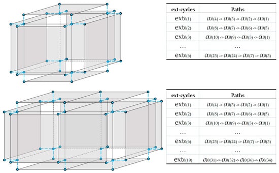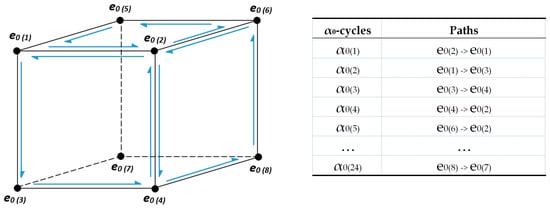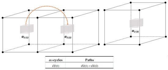 - α3-cycles: α3-cycles are all the cycles that define paths through three-dimensional cells (i.e., volumes), that is, volume adjacencies in 3D or paths that connect three-dimensional volumes not contained in any four-dimensional cell to the cell of smallest dimension (any cell of dimension at least 5 in nD) that contains it (see Figure 4). The later paths do not exist in the case of 3D city models.