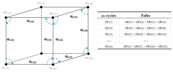 - α0-cycles: α0-cycles are all the cycles that define paths through 0-dimensional cells (vertices), i.e., edges or paths that connect vertices not contained in any edge to the cell of smallest dimension (face or volume in 3D or any cell of dimension at least 2 in nD) that contains it (see Figure 1). The later paths do not exist in the case of connected 3D city models (i.e., consisting of only one connected component). Furthermore, the α0-cycles that do not appear in the list of elements of any α1-cycle are cycles that are not boundaries.