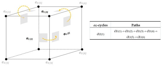 - α2-cycles: as illustrated in Figure 3, α2-cycles are all the cycles that define paths through two-dimensional cells (faces), i.e., volumes or paths that connect faces not contained in any volume to the cell of smallest dimension (any cell of dimension at least 4 in nD) that contains it. The later paths do not exist in the case of 3D city models. Each cycle of faces is assumed to be ordered in the clockwise orientation from a viewpoint in the interior of the volume to which it belongs.