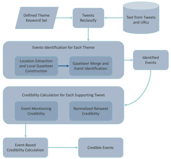 The structure of the credibility framework (Figure 1) starts with text information within tweets and URLs using predefined keywords as filters to reclassify tweets into different theme groups related to disaster situation awareness. Events were identified within the extracted locations and posting times, and location with different expressions was merged after coordinates (geocoding) collocation. The overall event credibility was based on the credibility calculated for each supporting tweet and its retweet. A higher overall credibility score indicates that the event is more trustworthy.