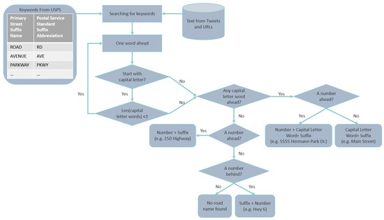 The location extraction focused on road and place names mentioned in the Twitter data, and the local gazetteer was constructed based on the extracted locations. This approach addresses road and place names separately as they have different characteristics. Taking road name extraction as an example (Figure 2), the overall procedure searches the tweet content for road names with a list of commonly used street suffixes (e.g., street, drive) and alternative abbreviations (e.g., st, dr.) according to the United States Postal Service (USPS). Once a suffix is located, the road name is extracted. The same principle is applied for place name extraction, except the list of place name suffixes is based on analyzing local area place naming rules (e.g., university, center).