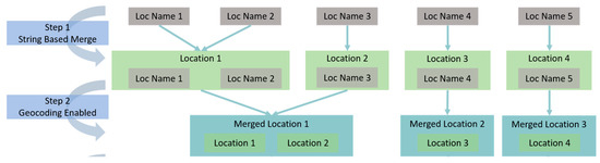 Step 2: Geocoding enhanced merge in which each location is geocoded using Google Maps Geocoding API [31]. When associated with coordinates, place names, addresses, and zip codes, a geographical approach is applied to merge these gazetteers for a second time.