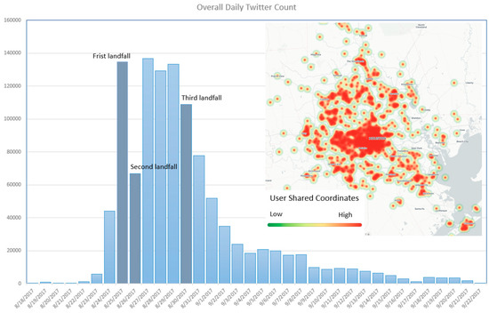Spatiotemporal distribution of original data. The map (center in the Houston area) shows geographic distribution within all user shared coordinates, and the bar chart demonstrates a temporal distribution. Three landfalls are marked in dark blue color on August 25, August 26, and August 30.