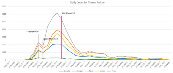 The map of overall daily tweet count and theme-related tweet count demonstrates the major affected area (Houston) during Hurricane Harvey (Figure 4), displaying the distribution of the tweets using user-shared locations and the largest hotspot revealed in the Houston area, the first landfall site for Hurricane Harvey. There were three landfalls in total, starting on August 25, 2017, and all the related tweet counts reached their peak on this day of the first landfall. The most tweeted theme was Flood, a reasonable theme for a hurricane event. Tweet counts for all themes, except that for Power, dropped dramatically after the last landfall on August 30, 2017.