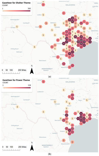 Based on the resulting local gazetteer, the space–time scan statistics was applied to identify events that are statistically significant (Figure 7). Each event is an occurrence that happened during a specific time frame and within a spatial range. A specific space–time cluster defined by this time frame and spatial range contains all tweets that belong to this event. For example, events happening at College Station and Texas A&M University are considered as the same “POWER” event (Figure 7b). The Power theme event table contains 252 events, and four other tables for Casualty, Damage, Flood, and Shelter, containing 716, 1,898, 3,672, and 1229 events, respectively.