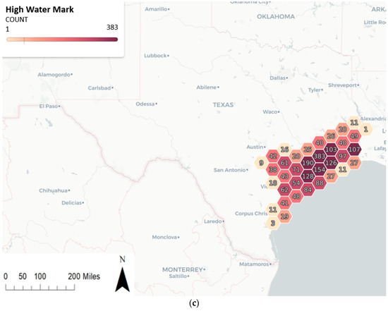 Spatial information is a critical component in credibility calculation. Corresponding news related to three of the four events corroborated this conclusion, confirming that the locations extracted from the tweets are valid [42,43,44]. In addition, high water mark (HWM) data obtained from USGS flood event viewer [45] that are presented in Figure 6c indicate the extracted geographic distribution of tweets can represent the actual geographic distribution of Harvey’s impacts. Calculating the Pearson correlation for location distribution of Shelter and HWM, an r of 0.879 illustrated a perfect positive linear relationship between variables. The r for location distribution of Power and HWM is 0.93, which is even better.
