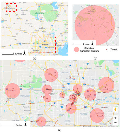 Detected space–time clusters in College Station and Houston regions: (a) Study area; (b) college station region; (c) clusters in the Houston region, with different sizes of red bubbles indicating different sizes of spacetime aggregation.