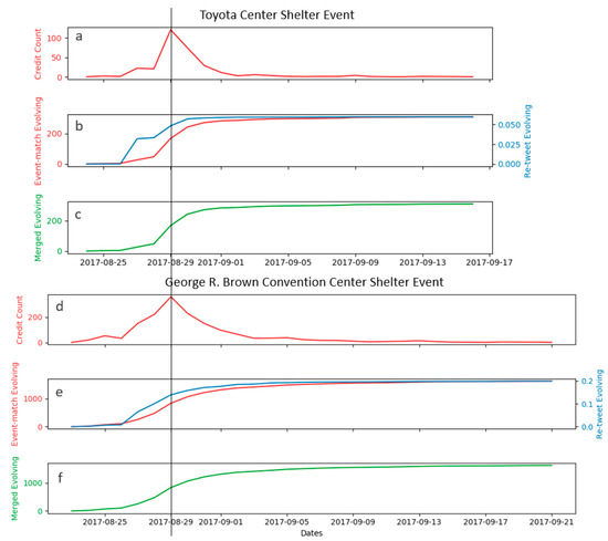 Evolving credibility of two event examples (Toyota Center (Panels a, b, and c) and George Brown Convention Center (Panels d, e, and f)). Panels a and d are credit counts, panels b and e are event-match evolving, and panels c and f are merged evolving.