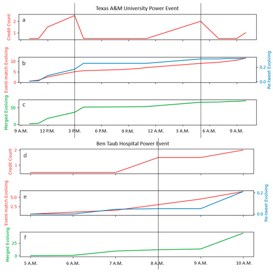 The evolving credibility under the Power theme for Texas A&M University (Panels a, b and c) and Ben Taub Hospital (Panels d, e, and f). Panels a and d are for credit count, panels b and e are for event-match evolving, and panels c and f are for merged evolving.