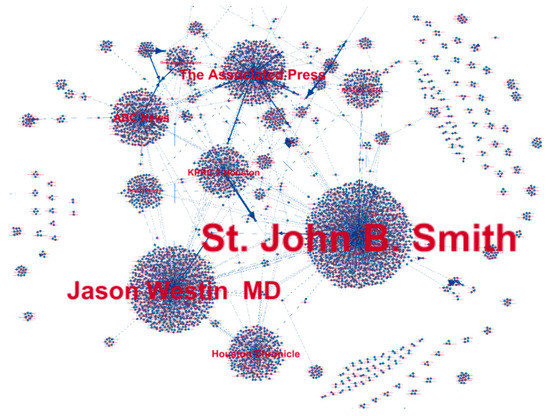 The sources of a particular event are crucial for the evaluation of credibility, and the networks of social relations provide essential contributions. The social network built for the Toyota Center Shelter Event (Figure 10), an event with high credibility (Figure 8), is established by the retweet relationships among users as displayed using Gephi [46]), an open-source visualization platform. Twitter account St. John B. Smith is the most significant source for the event and is followed by Jason Westin MD, ABC News, Houston Chronicle, The Associated Press, and KPRC 2 Houston. The most contributing account, St. John B. Smith [47], is a public safety reporter at Houston Chronicle [48], the largest daily newspaper in Houston. The Associated Press [49] is a US-based not-for-profit news agency, and ABC News [50] is the news division of the American Broadcasting Company. These news outlets are generally regarded as trustworthy information resources, indicating that our framework provides credible results. Social networks can be applied to all trustworthy events to assist in the flow of information and a better understanding of how the events unfold.