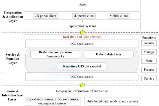 A GIS is a layer-based system for processing logical data information, services, and applications. The characteristic of the real-time and open GIS framework is the full integration of real-time computing and open services. Therefore, a layer-based architecture of a real-time and open GIS, called the GeoSensor, was proposed, as shown in Figure 1.