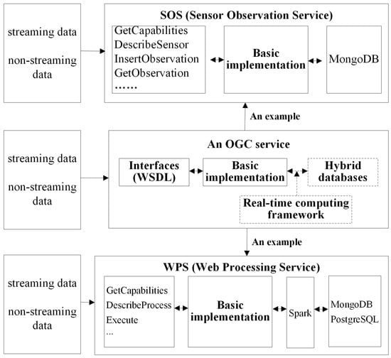 OGC open services expose their interfaces to users, while users do not know and do not need to know how they are implemented. Therefore, the key problem of implementing a real-time OGC service is choosing a real-time computing framework and a suitable database to support its basic implementation, as shown in Figure 3. Integrating the OGC services seamlessly with a real-time computation framework and hybrid databases requires the design of a system architecture, in which the “shell” is an OGC service interface and the “kernel” is a real-time computation framework and a hybrid database. Each OGC service may need to adapt a hybrid database. Chen describes an adaptation method []. The adapter includes configuration files and an abstract factory design pattern intended to “provide an interface for creating families of related or dependent objects without specifying their concrete classes” [].