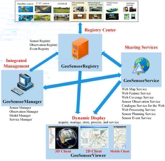The GeoSensor was implemented based on the ideas proposed in Section 2.1 and Section 2.2. The GeoSensor is a service-oriented architecture and has four sub-systems known as the GeoSensorRegistry, GeoSensorManager, GeoSensorService, and GeoSensorViewer, as shown in Figure 5.