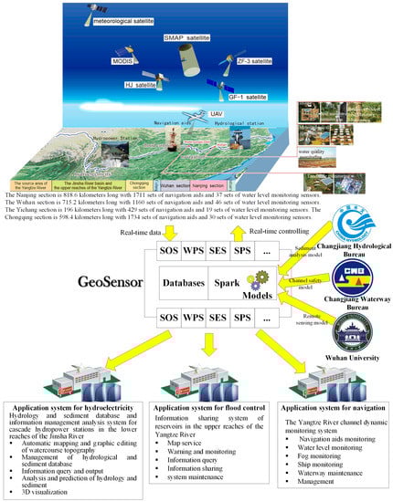 The Yangtze River has the largest watershed in China, and the total length of the river is more than 6300 km. The Yangtze River is the “Golden Waterway” that crosses the eastern, central, and western parts of China and poses three great challenges including flood control, hydropower production, and navigation. These challenges require a real-time and open information system that can fully manage the information on water, rain, sediment, navigation aids, and more in the whole river in a timely manner and the results are derived from the information. The temporal frequency of information collection and maintenance is daily or monthly, which cannot meet the daily or hourly requirements. Different missions are managed by different governmental sectors. The resources, e.g., the data, sensors, models, and systems, are heterogeneous and dispersed in different governmental sectors, usually with too little sharing and interoperation. Most existing systems are traditional information systems with many artificial interventions, and their results lack real-time and efficient processing capacity. Governments and experts think that there is an urgent need to adopt advanced open and real-time GIS technology to manage and analyze real-time dynamic resources to solve problems. They think that it is time to construct a smart river. A smart river is a vision similar to that of a smart city that adopts emerging information technologies to solve problems that could not or were not easily solved before. Therefore, several governmental sectors, universities, scientific research institutions, and companies are working together to build a smart river with the GeoSensor.