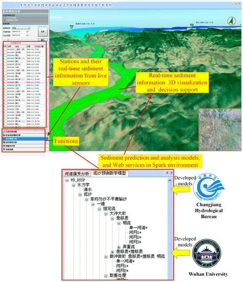 The real-time and open system has been applied to manage and analyze the hydrology and sediment data and information of cascade hydropower stations in the lower reaches of the Jinsha River. The real-time and open system can perform a number of actions: accessing more than 300 hydrological and meteorological stations in the Jinsha River in real time, integrating dynamic hydrological, sediment, meteorological, and remotely sensed observation data, encapsulating the hydrology and sediment analysis and calculation model, the hydrodynamic model calculation, and the river evolution prediction model from different experts, e.g., from the Changjiang Bureau of Hydrology and Wuhan University, as shown in Figure 6. It can also support the analysis of river evolution, sedimentation, and flood evolution by 3D visualization and simulation in a timely manner and in an open way, as shown in Figure 7. The real-time and open system plays an important role in monitoring and providing early warnings for the waterpower generation of the Wudongde, Baihetan, Xiluodu, and Xiangjiaba hydropower stations in the downstream Jinsha River. For example, the Xiluodu and the Xiangjiaba scouring and silting power generation realized real-time scouring, silting from scouring, and silting at regular times. In the flood seasons of 2013, 2014, and 2015, 0.8 billion, 1.6 billion, and 1.8 billion cubic meters of water were saved ahead of schedule, respectively. The economic benefit was remarkable.