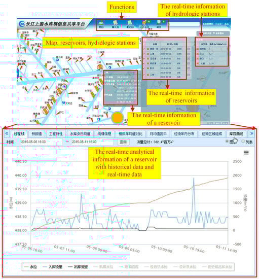 The real-time and open system has been applied to share the information of the reservoirs in the upper reaches of the Yangtze River, which is shown in Figure 8. The system provides integrated, remotely sensed data from meteorological satellites and dynamic observation data. It can access the rainfall and flow rates of the sensor data in a timely manner in an open way from more than 8000 hydrological and meteorological stations in the 21 reservoir groups. It uses Spark models to enable the real-time calculation of the observation information, forecasting, and dispatching information, and rainfall information of the large controlled reservoirs in the upper reaches of the Yangtze River. All of the comprehensive real-time information can be sent to the Yangtze River Flood Control and Drought Relief Headquarters in less than 20 min and to the National Flood Control and Drought Relief Headquarters in less than 30 min. Real-time calculations and information sharing helps with making flood control decisions by the joint operation of the 21 reservoirs in the upper reaches of the river, which meets the demand for flood control.