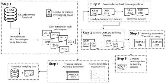 Figure 2 shows our main steps. Briefly, our first step was to download the OSM data history file and filter the contributions according to their timestamps. We obtained datasets for seven different years and resolved all logical inconsistencies, such as overlapping features. Second, we established a relationship between the OSM and CLC/COS first level of nomenclature. Third, we intersected the datasets to determine the area corresponding to the OSM dataset that matched the reference dataset. Fourth, we calculated the datasets’ completeness and thematic accuracies for 2012 and 2015. Fifth, random points were generated as training samples. Finally, in step six we calculated the NBTA for 2015.