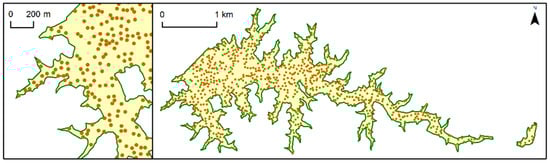 We also used NBTA to measure the fitness of the OSM data as a source of sampling data to support regional and rural LULC mapping. NBTA measures the extent to which the proximity of an OSM feature’s boundary influences the accuracy of the attribute (tag) in the training sample. We computed the NBTA for the most recent OSM dataset (2015). First, it was necessary to create training samples by generating random points inside the OSM features. Since OSM feature areas are very heterogeneous, it would be inappropriate specify an exact number of random points to be generated inside each OSM feature; instead, the total number of random points generated was proportional to the area of each OSM feature. In addition, the shortest distance allowed between any two randomly placed points was 30 m, because this is the most common spatial resolution of satellite images, such as Landsat (Figure 3). We used point features instead of polygon features since this minimized the effects of comparing data with different mapping scales. Each random point generated took the attribute of the corresponding OSM polygon feature.