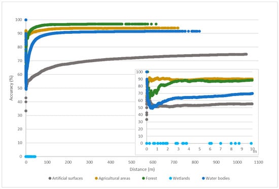 However, there was significant variability between the different LULC classes. Wetlands always presented 0% accuracy, as expected given the null thematic accuracy in 2015 described in Section 4.2., mainly due to the low total coverage (less than 0.001%). Forests, agricultural areas, and water had the highest overall accuracy. For the first two, this was expected since these areas are typically large and homogeneous. For both these classes, low accuracy values predominantly appeared close to the feature boundaries, but at ≥1 m from the boundary, high accuracy values were recorded linearly and were always above 85%. Water features behaved somewhat similarly, but accuracy only consistently improved to 70% at ≥10 m from the boundary, increasing linearly thereafter, but reaching 85% accuracy only at ≥45 m from the feature boundary. Overall, artificial surfaces behaved somewhat differently from the other major classes. Training samples for artificial surfaces reached around 60% accuracy within 0.5 m of the feature boundary, but this trend quickly reversed as distance increased, with accuracy decreasing to 50–55% at 0.5–40 m from the boundary. At >40 m from the boundary, accuracy values reached 60% and increased linearly, reaching 70% accuracy at 250 m and continuing to increase linearly with distance, eventually reaching a maximum of 75% accuracy.
