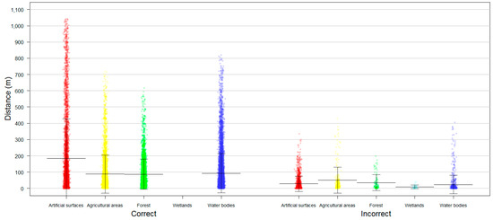 Figure 5 illustrates how the maximum distance from a training sample to the nearest feature boundary varies moderately between each LULC class. On average (excluding wetlands), errors were very close to feature boundaries, but a more nuanced reading of the accuracy values and training sample distances can be seen. For features in the water class, at ≥406 m from the boundary (49% of the maximum distance) there were no misclassified (incorrect) training samples. Agricultural areas had similar results, with 100% accuracy at ≥427 m from the boundary (59% of the maximum distance). Both forests and artificial surfaces had high accuracy values beginning at >32% of the maximum distance (corresponding to ≥199 m for forests and ≥337 m for artificial surfaces).