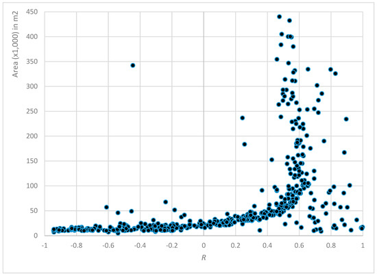 However, the relationship between the training samples accuracy and their proximity to the corresponding feature boundaries did not consider the influence of each feature area in explaining the degree of accuracy, since the distance to a feature boundary varies across feature areas. Are features with larger or smaller areas likely to have more or less accuracy? Therefore, the distance values from all training samples were standardized using the maximum and minimum distance values of the corresponding OSM feature. Similarly, the accumulated accuracy of all training samples was computed by considering each OSM feature. The relationship between a feature’s boundary proximity and its thematic accuracy is denoted by the Pearson correlation coefficient (R), which was calculated separately for each OSM feature. OSM features with fewer than three training samples were excluded from the analysis (20% of all polygons, for 2015), because when n = 2 the R coefficient would always be −1 or +1, except in the improbable circumstance that both y-values perfectly matched.
