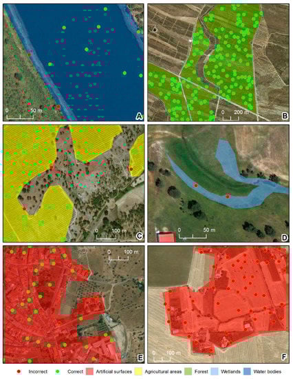 Artificial surfaces presented two different behaviors. For consolidated urban areas, such as the region’s main town (Beja) [49], the features behaved identically to the agricultural and forest areas. However, in more dispersed settlements (which were predominant in the Beja district), differences in interpretation of the MMU between the contributors (who were more likely to map everything in detail) and the technicians responsible for COS mapping (who were bound to the rules of cartography at a scale 1:25000) could explain the comparatively low accuracy. In addition, dispersed settlement areas demarcated by the contributors as artificial surfaces had relatively small dimensions, since contributors start considering houses far apart from each other’s as isolated elements.