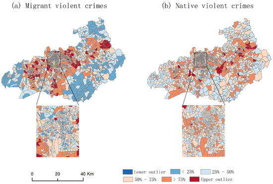 4.1. Spatial Patterns of Violent Crimes Committed by Migrant and Native Offenders
