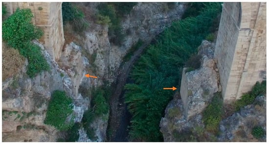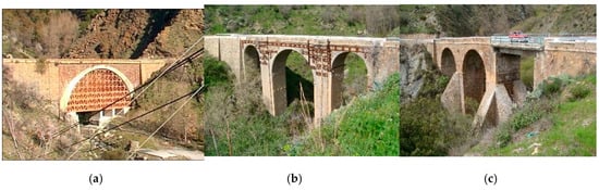 The Ízbor bridge is located in the Betic mountain range, which has notable geotechnical instability and high seismicity. This situation has triggered several pathologies in the old bridges which are still in service, requiring conservation measures to prevent their collapse. Some examples of these pathologies include: (a) The bridge over the Bayacas river in Órgiva, where a metal brace structure had to be built to prevent the arch from collapsing (Figure 1a); (b) the bridge over the Válor river, where the sides of have been reinforced with metal straps (Figure 1b); (c) the bridge over the Viñas river, also in Válor, where one of the arches has already fallen and been replaced by a modern concrete plank (Figure 1c). The fact that the Ízbor Bridge is better conserved than the other three bridges prompted us to choose it to formulate an H-BIM and propose its management, thereby preventing it from becoming a ruin like the others.