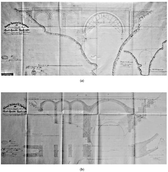 Before beginning the modeling phase, we analyzed the existing bridge documentation in order to understand the different parts of the structure and the construction process. For this, the project drafted by the Ministry of Public Works of Spain in 1859 served as the starting point. This project provided bridge details that would not have been possible to detect with the exterior capture of its geometry, such as stone reinforcement of the arches or stirrups (Figure 2).