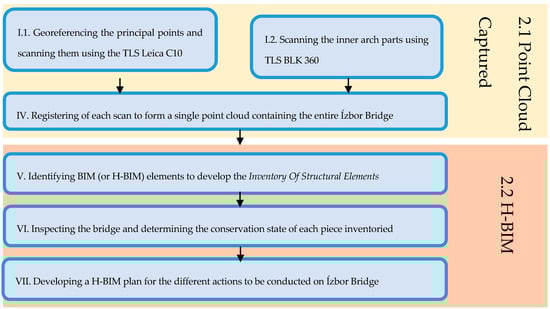 This research presents a bridge-modelling workflow, taking into account the nature and peculiarity of these kinds of bridges, with the goal of cataloging and preserving them. Thus, because this research focuses on bridge modeling, we refer to it as “historical bridge information modelling” (HBrIM). However, as the BIM process should be as standardized and made as comprehensive as possible, we call this process “H-BIM”. For this, we analyzed the bridge spanning the Ízbor river in the province of Granada (Spain). Usually, this kind of historical monument has no technical documentation that could direct effective management or conservation works.