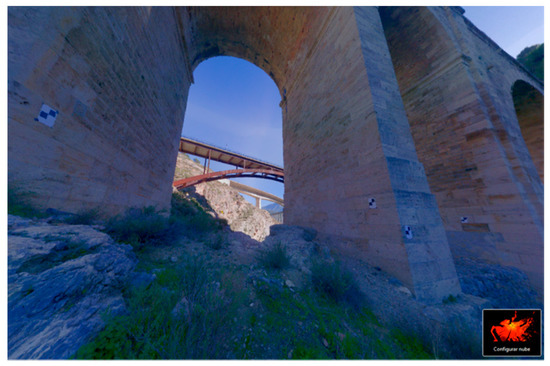 The inner parts of the arches were captured with the laser scanner BLK 360 placed on the scan stations not labeled in Figure 6. We used the BLK360 because the access to the bottom of the bridge was so steep that it was not possible to transport the C10 load. For the registration of the BLK360 scan stations, we used targets (Figure 7), which appeared both in the BLK360 scan stations and in some of the C10 scan stations (Figure 6 shows a link between the IZB4 and a BLK360 and also between the IZB7 and another BLK360). The registration of the BLK360 scan stations was processed using the software Cyclone Register 360, and in all the cases the link error between two scan stations was less than 0.015 m.