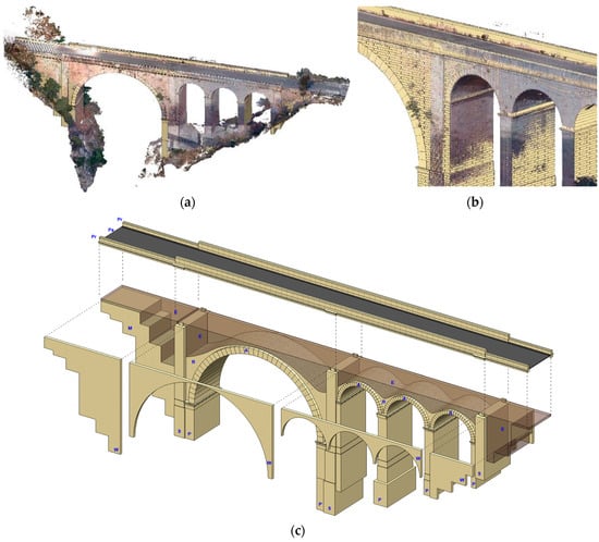 Ízbor bridge PC (Point Cloud) and the BIM (Building Information Modeling) model. (a) and (b) PC and modeling. (c) exploded view of Ízbor bridge BIM model.