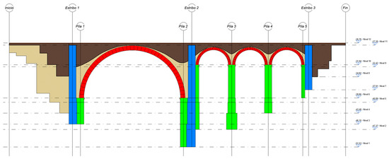The modeling of the bridge and the linking between elements required 12 levels to be defined: The abutments were modeled by wall-type families (blue in Figure 9); the piers by pier-type families (green); the voussoirs with beam-type families (red); the pavement by soil-type families (orange); the enclosures and parapets by wall-type families (not visible in Figure 9), there being a relationship between each of these elements. The stone fillings (yellow in Figure 9) and earth fillings (brown) were modeled by in situ families without connection to the rest of the structural elements.
