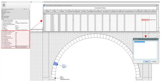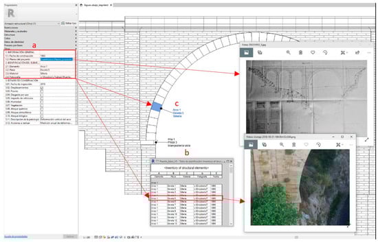 To manage each part into which the bridge was divided, the following shared parameters were created: 1.1. Date of construction, 1.2. Project plans, 2.1. Element, 2.2. Piece, 2.3. Construction material and 2.4. Photography. The identification parameters of the Arc_1 element and the Dovela_5 piece is shown in Figure 10a. All the bridge pieces were dynamically compiled in a table entitled Inventory Of Structural Elements (Figure 10b), which can be edited and expanded according to the conservation needed. The parts were indicated using multi-category labels in which the element, the part, and the material appear (Figure 10c).