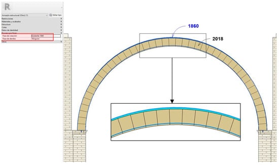 The final step of the H-BIM developed was to plan the different actions, using the BIM tools, which needed to be conducted on the bridge. For this, we defined the execution phases of any measure taken and the acquired state of any of the parts defined in this process (existing parts, demolition, temporary or new elements). In the case of Ízbor bridge, the structure was modeled according to the project prepared in 1860 (Phase 1860) and to the PC captured (Phase 2018). From this comparison, we detected the changes and deformations that had resulted over the previous 158 years.