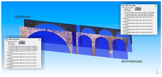 Furthermore, the bridge was analyzed for verticality. For this, the following process was followed: (1) the PC was sliced to determine some parts that, a priori, formed two planes (one for the PC of the downstream portion of the bridge and another for the PC of the upstream portion of the bridge). (2) Afterwards, the plane best fitted to the previous PC was generated. (3) Finally, given that the PC was leveled, the inclination angle of the normal vector of each plane was measured with respect to the world axes, indicating that the two planes formed 90.1 sexagesimal degrees with respect to the axis (Figure 13). This value reveals a discordant inclination of 0.1 sexagesimal degrees. Nevertheless, the Ízbor bridge cannot be said to be leaning, as this minor inclination of the planes may be due to the errors inherent in the measurement process.