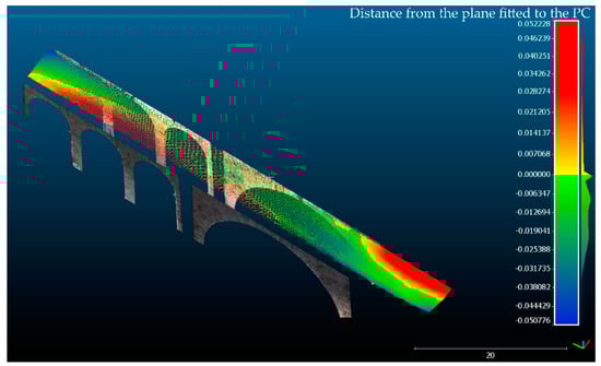 According to the bridge platform, we performed a geometric analysis based on the resulting PC. For this, we generated the best-fitted plane and we computed the distance from the plane to the PC (Figure 14), observing that two zones were raised approximately 5 cm above the adjustment plane. This may be due to platform sets or due to the design camber in the project.