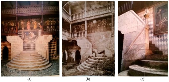 The main staircase in the courtyard of (a) the Fenis Castle (AO) in 2004 and (b) back to 1884 [29]. (c) The same scene in the courtyard of the Medieval Rocca in Turin.