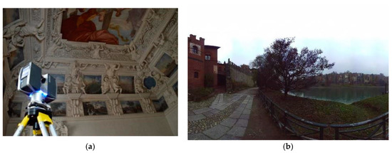 Nowadays, the well-consolidated techniques that are able to produce a 3D recording of the built heritage can be divided into two main categories, namely image-based and range-based techniques [3,4]. The image-based techniques are related to the use of photogrammetric acquisitions, primarily close-range or Unmanned Aerial Vehicle (UAV). Nowadays, this methodology is probably one of the most used in the architectural survey field, according to the significant developments of the last decade in terms of sensors and algorithms, even more, based on a computer vision approach—the well-known Structure from Motion (SfM). Because it could be considered to be low-cost, easy to use, flexible (multiresolution and multiscale), and, thanks to the massive use of UAV, photogrammetry allows for moving the point of view from the terrain to the air. As a consequence, in every work related to the survey of a complex site, starting from the archaeological areas [5,6], up to the built heritage complex site [7,8,9,10], the use of photogrammetric techniques are used with the aim of extracting 3D point clouds, 3D models, or simple orthoprojections. Further developments in this field are connected to the use of different sensors, such as multispectral, hyperspectral, thermal or mobile devices [11,12], and in the employment in terrestrial or UAV applications of the new generation of panoramic /spherical cameras [13,14]. The range-based techniques (i.e., LiDAR, Light Detection and Ranging), dating back to the early ‘80s, have recently developed different strategies for data management and processing [15,16], along with several workflows and a lot of device improvements, to produce high-performance point clouds in terms of accuracy (short-range vs long-range scanners), speed of data acquisition (Time of Phase vs Phase Shift), and radiometric quality (embedded or external camera). Starting from the reliability of the LiDAR in connection with the evolution of the computer vision algorithms and the improvement of the inertial systems in mobile platforms, an emerging methodology that is even more frequently used for survey purpose is the SLAM approach. These techniques could be considered to be a Mobile Mapping System (MMS), where a moving head is equipped with a ranging measurement laser capturing two-dimensional (2D) point profiles, an inertial measurement unit with triaxial gyros, accelerometers, and three-axis magnetometers. Over the last year, different tests and applications have been carried out through the use of this system [17,18,19] and, according to the achieved results, it could be considered to be more than suitable for architectural scale purposes, also in articulated and compound environments [20], even indoor areas. The problems of RGB data and (geo)positioning issues are currently not completely solved.