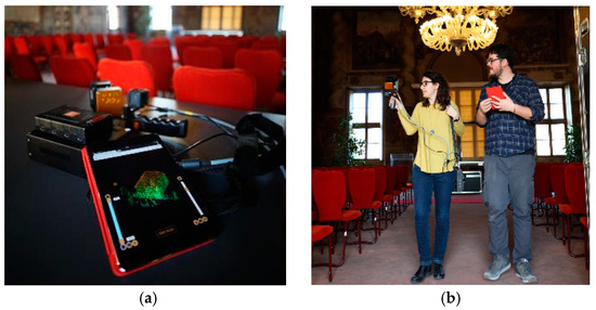 The ZEB Revo Real Time Mobile Mapping System (RT MMS) by Geo Simultaneous Localization and Mapping (GeoSLAM): (a) The data logger, the rotating head and the Go Pro mounted above and the IPad Pro employed for the real-time view during the acquisition phase; and; (b) Operators scanning the Great Salon with the instrument.