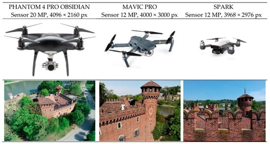 According to the aim of the work that is connected to multisensor and multiresolution data acquisition and processing, in the analysed areas, different UAVs have been employed (Figure 5) accurately to document the built heritage from different points of view.