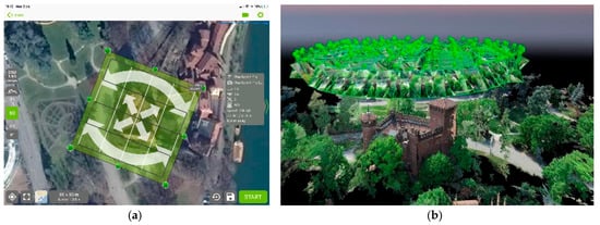 Over the analysed area, a complete UAV survey was planned and performed using the aforementioned platforms to accurately describe the external part of the castle. Despite the use of different platforms, hereafter only the Phantom data will be considered as a general example for using the UAV for data acquisition and extracting 3D information from above. Complying with the consolidated trends in UAV image acquisition [45,46], the flights over the Rocca were planned with the aim of acquiring nadir and oblique images. According to a limited extension of the surveyed object; first, a double grid acquisition with the nadir camera axes was performed (Figure 6b). This first flight was made with a longitudinal overlapping of 80% and a lateral overlapping of 70%. Furthermore, a circular flight with the camera axes at 45° was carried out, in this case, the angle between the adjacent images was 5° with the camera being oriented to the centre of the circle. The Rocca was covered with 137 images with two different flights at an average flight height of 50 m (the height of the Rocca is about 32 m). The Pix4DCapture application was used for planning (Figure 6a) and performing the different flights to obtain a complete reconstruction of the Rocca (Figure 6b).