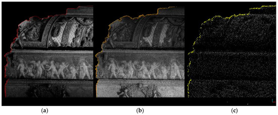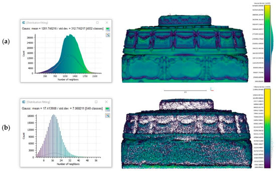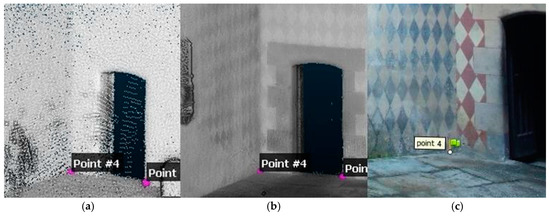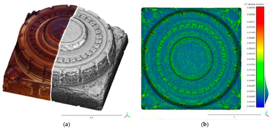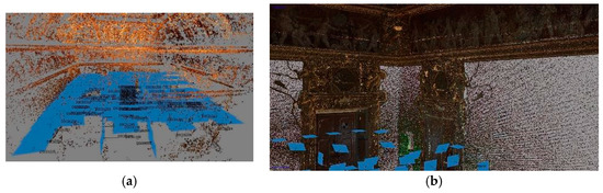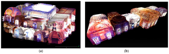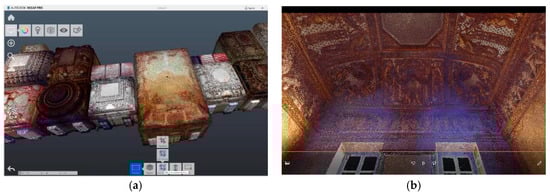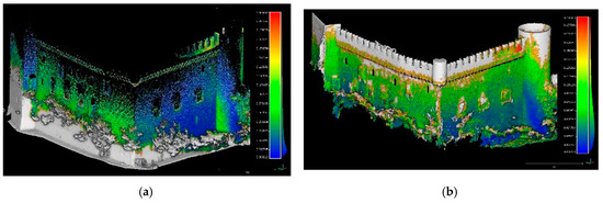 According to the consolidated practice of traditional TLS acquisition [49,50] and scans registration, a huge number of scans data were obtained to cover all of the architectural contexts. As usual, the scans acquisition was supported by control points topographic measurements and distribution guaranteed the suitable surfaces coverage with adequate overlapping.