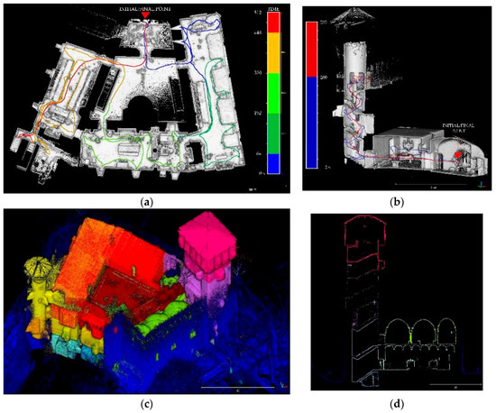 The output point clouds consists of a set of different available formats (*.las; *.ply; *.E57; *.asc) and very useful information can be calculated on the points surface, in the format of attributes that are associated with points (Figure 9b): i.e., normal, SLAM quality, time, elevation, etc. Section 4 contains discussion regarding these aspects. The selected area of the Rocca meets the ZEB requirements; in fact, it contains both indoor articulated places and open enclosed spaces, as previously described (Figure 8c,d). In the case of one-way blind tracks, as in the towers of the Rocca, the roundtrip trajectory was the only solution, to obtain good results. For this kind of environment, the employment of the ZEB Revo represents a useful solution thanks to its manoeuvrability and time speed, which allows for the operator to move freely in narrow spaces.
