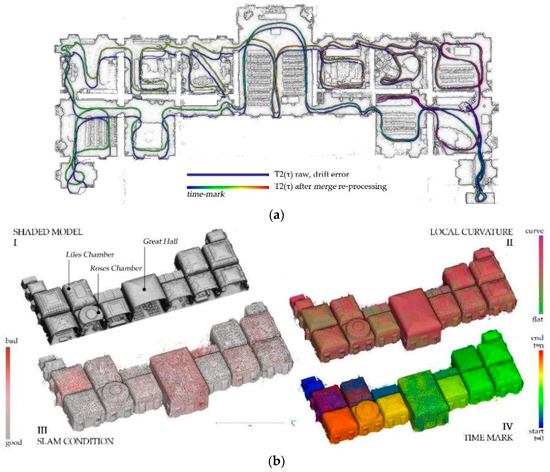 The ZEB survey in the Valentino Castle: (a) The plan view with the closed loop T2(τ), performed, before (blue) and after (range colours) the SLAM reprocessing by merge function correction; (b) the attributes related to ZEB-based point cloud processing, inside the GeoSLAM Hub platform. Along with an axonometric representation of the main floor in shaded view (I), there are normal mapping (II); SLAM quality condition during the scan (III); time-stamp information (IV). Each thematic result is associated with its own trajectory data as well.