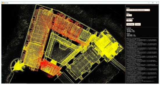 One of the main matters affecting the ZEB Revo point cloud, in parallel to the accuracy of the points model, is the lack of positioning data. The origin of the reference system for each scan is the starting point and the orientation of axes XYZ is related to the rotating head: in fact, the X reference axis is normal to the scanner’s back plate. In this way, it is possible, if initialized vertically, to rotate the X-axis to the East and to then perform the survey at least roughly following the North–South reference system, as investigated in [39]. Furthermore, the relative positions between multiple scans of the same survey set are also not assured to be aligned, due to the possible change of position of the rotating head at the initialization moment. Therefore, to manage all the scans in the same relative reference system, the simple single roto-translation and mutual ICP fitting applied on each ZEB scan can be now effectively avoided by the application of the “Merge” algorithm function (Figure 10), as implemented in the last desktop release of GeoSLAM Hub software for the scans processing [19].