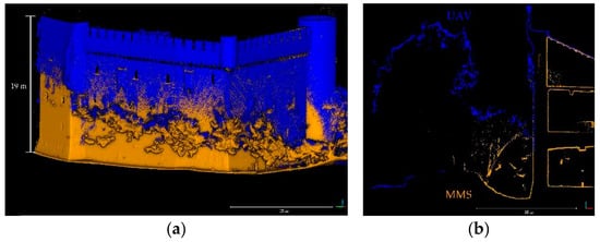 Nowadays, it is clear that the main issues driving the research test and validation are addressed to the data processing and management in terms of data and procedures optimization. The different techniques allow for extracting or collecting 3D point clouds and the fusion of the different achieved results is an accepted methodology [21,22,23]; these products constitute the starting point for different following steps that could drive the surveyors to carry out a traditional drawing, an orthophoto, a 3D textured model, or to define the geometry behind an Heritage Building Information Modelling (HBIM). The next sections are dedicated to reporting the experiences of our research group, which aimed at obtaining a final hybrid model, i.e., derived from a combination of fusion and the integration of multisensor data.