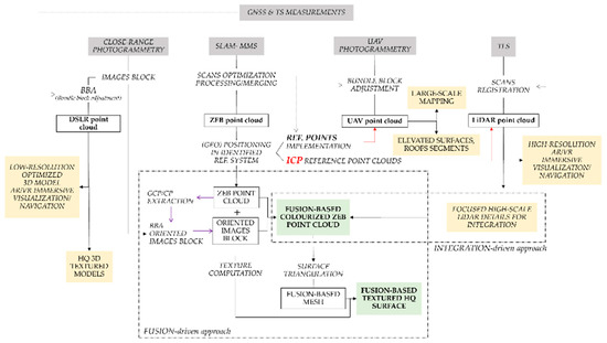 The advantages and disadvantages of each sensor combined with a critical environment suggest undertaking a mixed approach of techniques to obtain a hybrid model. Integrated- and fusion-based approaches could be winning solutions, customizable according to specific needs, in terms of time, costs, and sensors that are finalized to obtain predetermined final products with specific levels of detail, as shown in Figure 21. Following general procedural steps (planning, survey, processing, analysis, and communication), different considerations can be stressed.